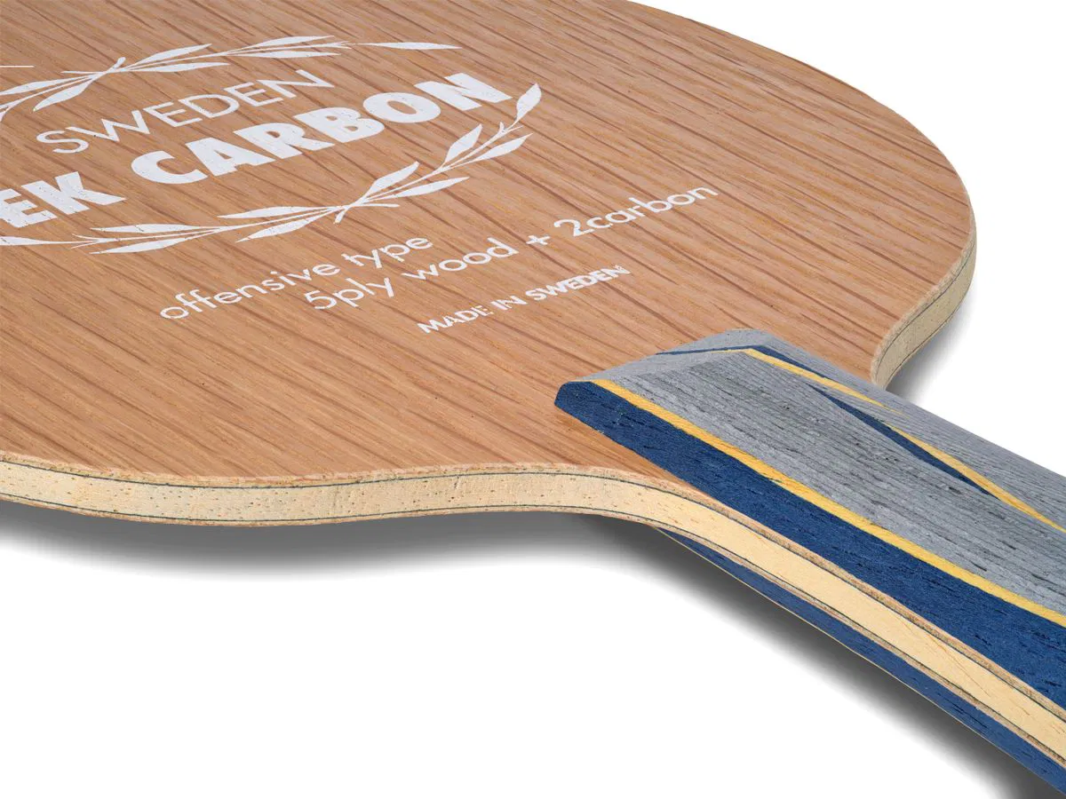 Sweden EK Carbon blade features five wood plies with two inner layers of CFNW (Carbon Fleece Non-Woven), strategically placed to enhance performance. The outer veneers are made from Scandinavian oak (referred to as “EK” in Swedish), a hard wood that increases the blade’s stiffness and speed, providing a solid and responsive feel during play. The inclusion of CFNW contributes to a larger sweet spot and improved stability, allowing for powerful and consistent shots from Close-to-mid distance.